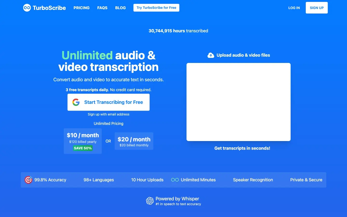 Start Transcribing for Free — Convert unlimited audio and video files to accurate text. 99.8% accuracy. 98+ languages. Transcribes in seconds. 3 Free Transcripts Every Day. Download as docx, pdf, txt, and subtitles. Import audio and video files. Export accurate text and subtitles. TurboScribe is fastest, most accurate AI transcriber on Earth. Export as PDF, DOCX, subtitles (SRT), TXT. The world's only unlimited transcription service. No caps or quotas. Unlimited minutes. Say goodbye to errors: Our AI transcription service boasts near-perfect accuracy. The only unlimited transcription service on Earth. No caps or quotas. Verbatim audio to text. Transcribe audio and video in seconds, not days. Generate subtitles and transcripts automatically. Start transcribing for free. Upload audio and video files. Download accurate text and subtitles. Turn audio to text in seconds. Turn speech into accurate text. Get Started Free. Speech to text. Voice to text. Audio to text. Video to text. MP3 to text. Video to subtitles. Convert audio to text. Convert audio and video to accurate text in seconds, not days. Unlimited Minutes. Download as pdf, docx, txt, subtitles. Video to captions. Mind-blowing accuracy. Breathtakingly fast. Next-gen AI for lightning-fast, accurate transcriptions. Convert MP3 files to text. Get accurate transcripts in seconds, not days. Lightning fast. Unmatched 99.8% accuracy. 24/7 transcription.
